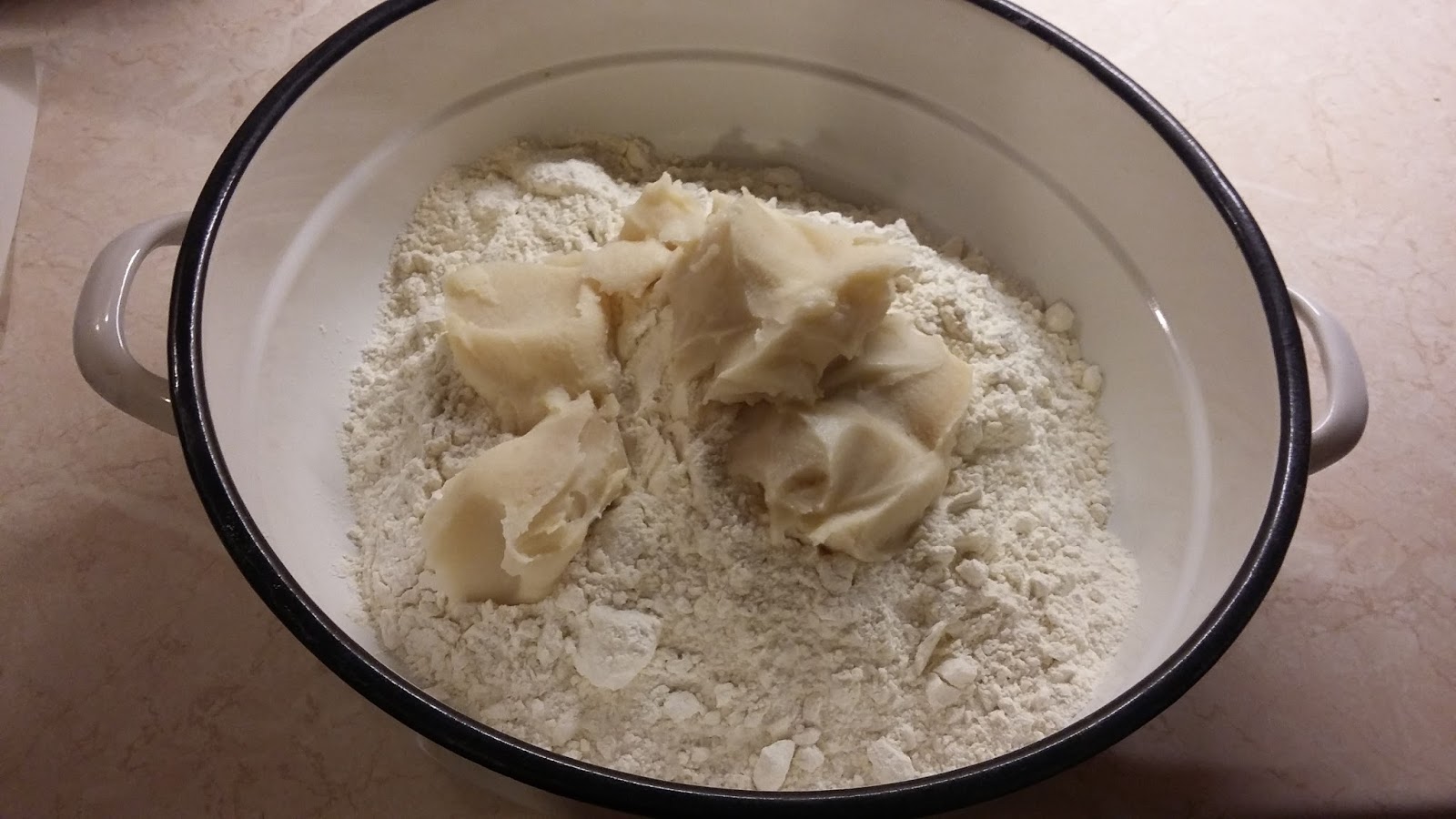 A lisztet a sót a zsírral elmorzsoljuk, hozzáadjuk a sütőport.